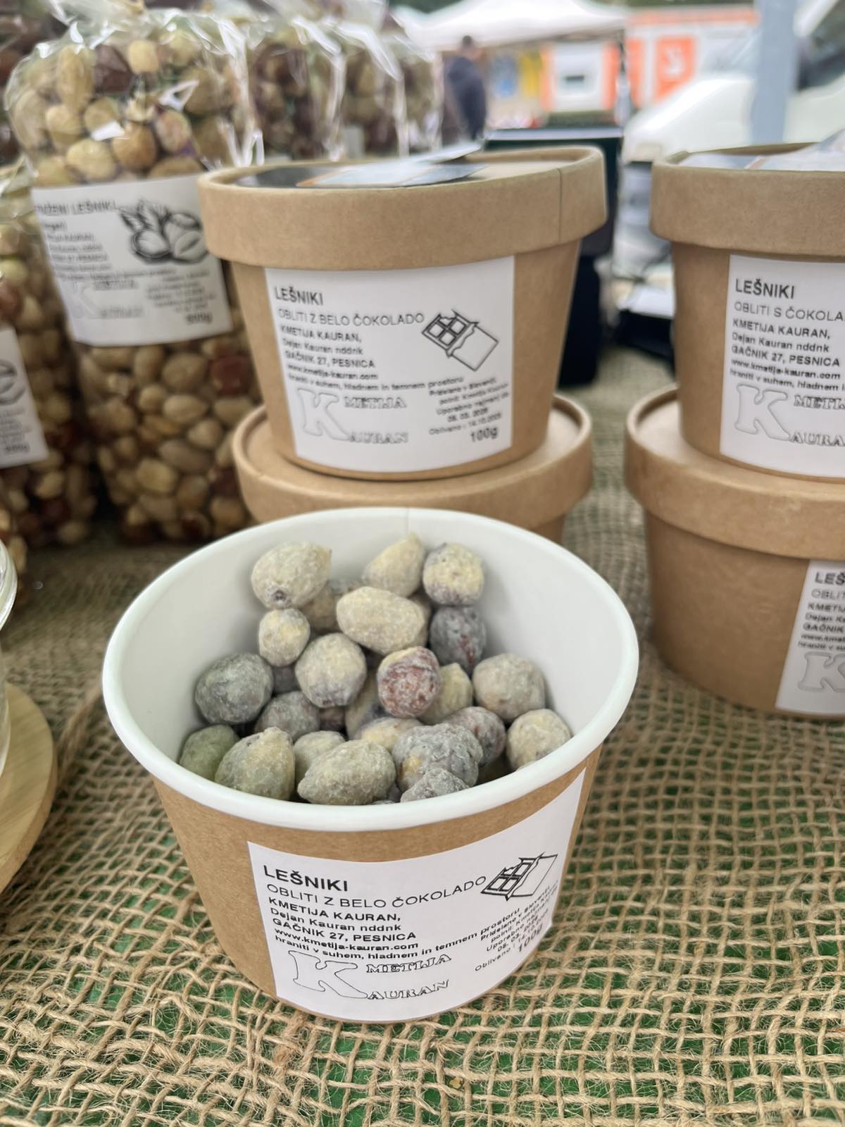 Praženi lešniki obliti z belo čokolado. Lešniki so suho praženi v pečici. Pridelani jeseni 2025. Rok uporabe 6 mesecev od oblivanja pri pravilnem shranjevanju. Hraniti v temnem, suhem in hladnem prostoru. Poreklo: Slovenija – kmetija Kauran